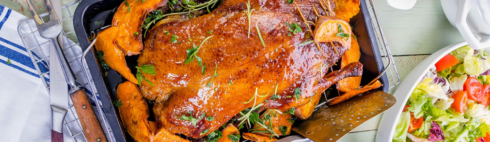 Clean the duck and rub it – inside and outside – with salt, pepper, smoked paprika, and marjoram. Cut the apples into pieces and place them inside the duck. Leave in a cool place for approx. 12 hours. Put the duck in a roasting tin and place the tin in the oven preheated to 180oC (gas mark 4) for approx. 2.5 hours – but after an hour make sure to reduce the temperature to 165 C (gas mark 3). While the duck is roasting, pour the melted fat over it 2-3 times. About 15 minutes before the end of the roasting time, add the sweet potatoes (salted and cut into wedges) to the tin. At the end, turni off the oven, and leave the meat to rest for another 20 minutes.