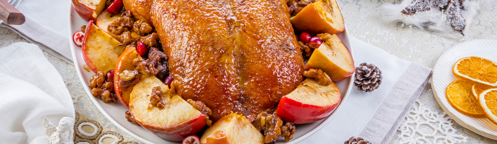 Wash the duck. Rub it generously with salt and pepper, and sprinkle with marjoram. Set aside for several hours. Cut the apples into quarters and put them inside the duck – together with a handful of nuts. Place in an oven preheated to 175 C (gas mark 4) for approx. 2 hours (i.e. 1 hour roasting time per 1 kg duck). Pour the melted fat over the duck from time to time.