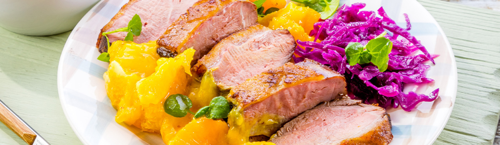 Wash the fillets and make cuts in their skin. Rub them all with salt and a little pepper. Heat the butter in a frying pan and place the fillets – skin side down. Fry for about 5 minutes over a medium heat, then turn them over and fry for another 5 minutes. Put the meat to a heatproof dish and place it in a hot oven, and pour over with the melted sauce from time to time. Roast for approx. 10-15 minutes. Prepare the sauce: peel the oranges and tangerines, and remove the pips. Place the pieces of fruit in a saucepan, add a pinch of salt, and boil for a while. Combine the sauce made after roasting the meat with the orange sauce, rub through a sieve to obtain a creamy emulsion. Cut the duck breast into strips. Serve with rice, for instance. Pour the sauce over the whole dish.