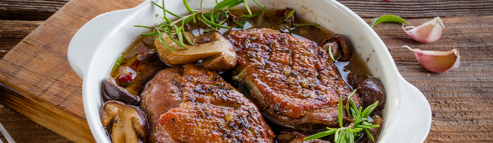 Cut the duck skin and season it with salt and pepper. Put the duck in the pan – skin side down – and fry until the fat melts out. Turn the fillets over and fry for about 2-3 minutes. After this time, put the fillets in a heatproof dish. Place the dish in the oven preheated to 170 C (gas mark 4) and bake for approx. 20 minutes. Cut the fresh mushrooms into pieces, boil them briefly, and drain. Fry the onion in a heavy-bottom saucepan and add the mushrooms. Season with salt and pepper and crushed garlic. Fry, stirring continuously, for approx. 2 minutes. Pour in a half of a cup of water, add the finely chopped sun-dried tomatoes, butter, a sprig of fresh rosemary, and parsley. Simmer for about 10 minutes. After this time, combine the mushrooms with the duck fillets in a casserole dish and keep them together for a few minutes to allow the flavours to combine.